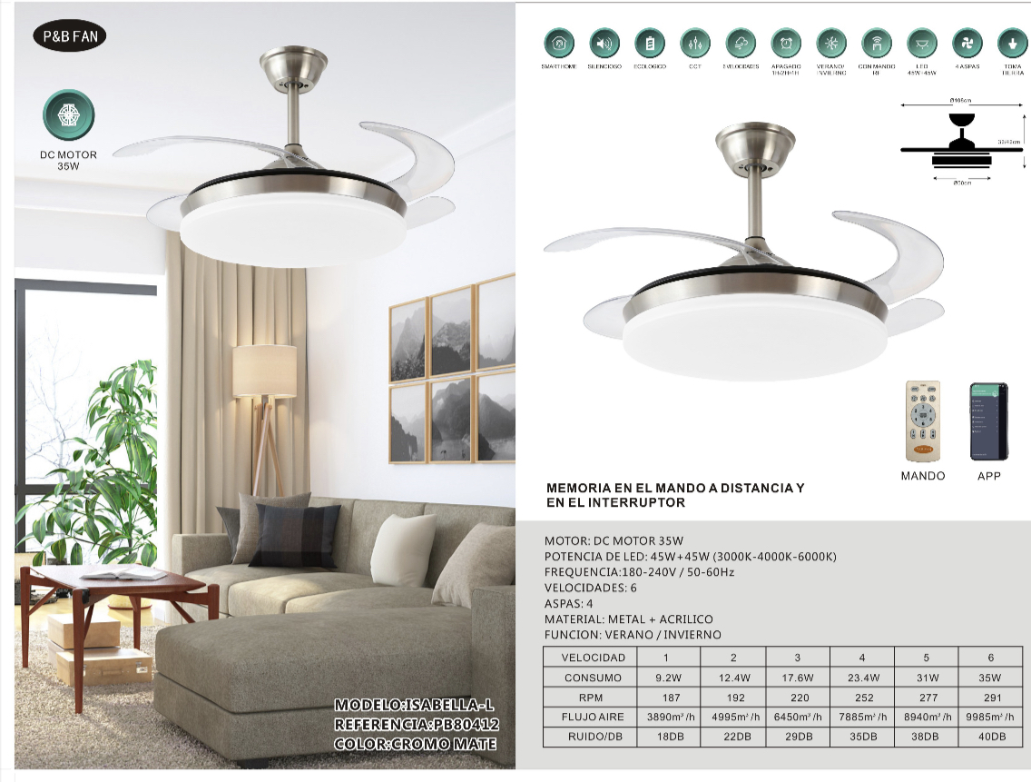 VENTILADOR ISABELLA-L 107 CM MOTOR DC 35W WIFI 6 VELOCIDADES 4 ASPAS CROMO MATE